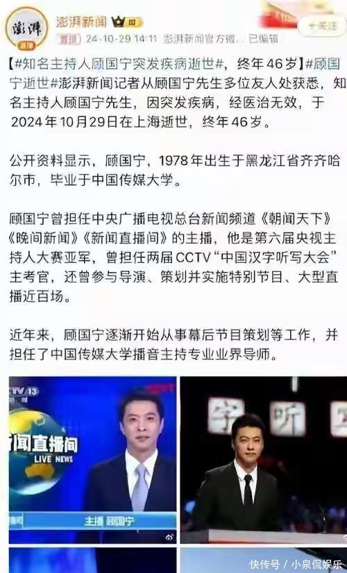 2024年10月29日,央视主持人顾国宁因肺腺癌去世的消息震惊公众。这位被誉为“央视最帅主持人”的儒雅才子,从确诊到离世仅15天,年仅46岁。他的突然离去,不仅让人惋惜,更引发了对健康、压力与生命意义的深刻反思。